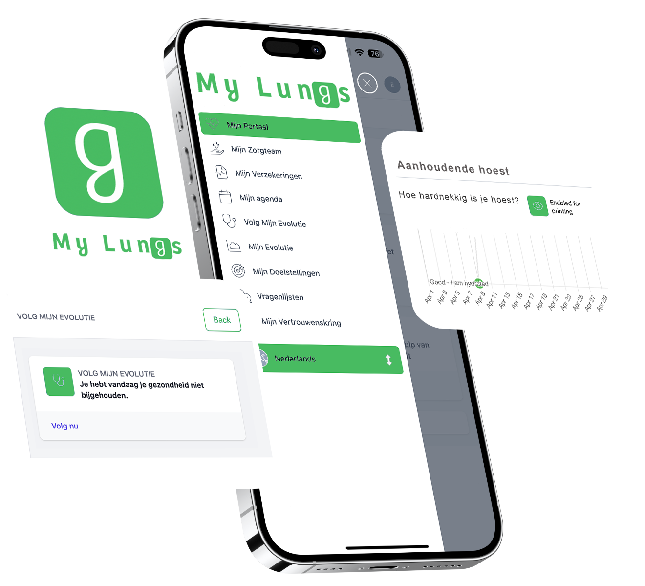 My Lungs helpt je om je medische traject en symptomen op een eenvoudige en absoluut veilige manier vast te leggen, zodat je deze kunt delen met je behandelende arts of je vertrouwenskring.
